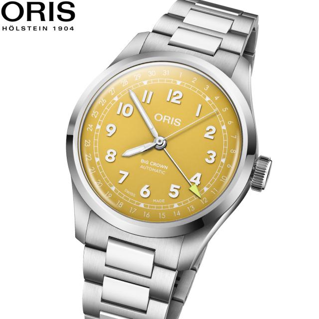 オリス伝統のビッグクラウンポインターデイト。2025年の最新作はフレッシュな見た目と気分が上がるカラーが特徴のスイス製機械式時計です。40mm径のクラシカルなケースにオリスを象徴するポインターデイト機構がデザイン上のアクセントを加えます。1か月をかけてポインターデイト針が文字盤を一周することでゆったりとして時の流れを感じることができます。ポップなイエローのダイアルは見る度に心配事も忘れるような、ついつい笑顔になってしまうカラーです。落ち着いたファッションスタイルの差し色としてオリスの機械式時計はピッタリです。ポリッシュ仕上げとサテン仕上げのH型リンクを組み合わせたブレスレットの仕様は、オン/オフ問わず使いやすいデザインで、ブレスレットと一体型のオリス自社開発バタフライクラスプは軽やかでありつつ高級感の感じられる着け心地を提供します。【オリス ORIS 2025 新作】