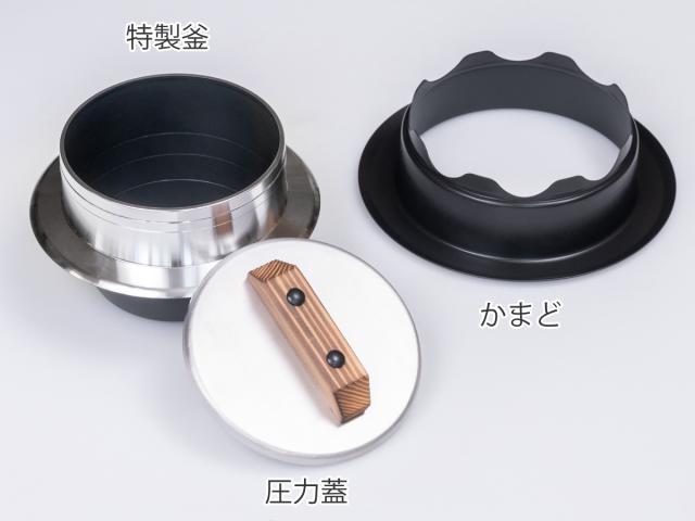 | 材質 | 【蓋】本体:ステンレス鋼、ツマミ:天然木 【釜】本体:アルミニウム合金、内面:セラミック塗膜加工、外面:施盤加工、つば下:耐熱焼付け塗装(セラミック塗装) 【かまど】本体:アルミニウム合金、内面:焼付け塗装(セラミック塗装)、外面:セラミック塗膜加工 |