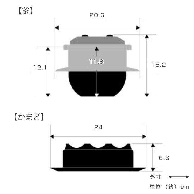 | サイズ | 【蓋】約 直径16.5×高さ3.9(cm) 【釜】約 直径20.6×高さ12.1(cm)、内径14.9(cm)、深さ11.8(cm) 【かまど】約 直径24×6.6(cm) |