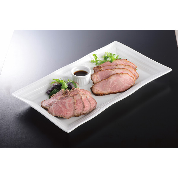 希少部位のトモサンカク使用のローストビーフと、豚肩ロース肉を使用ししっとり仕上げたローストポークのセットです。