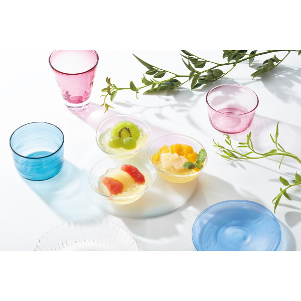 レモン果汁のゼリー液にキウイ・ぶどう・グレープフルーツ(2種)・マンゴー・パインを掛け合わせ、甘すぎない大人なゼリーに。