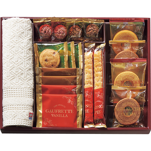 【 最新 2026 ギフト 】 スイーツアソート+S 今治タオル 組合せ ギフト バラエティ スイーツ チョコチップクッキー ロングスティックパイ バウムクーヘン ゴーフレット チョコレートクランチ ウォッシュタオル 日本製 綿100% ギフトセット おしゃれ 贈り物