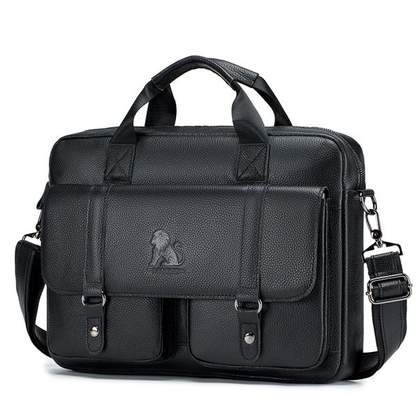 男性用本革ブリーフケース ダブルフロントポケット 大容量 コンピューターバッグ 斜めクロスバッグ