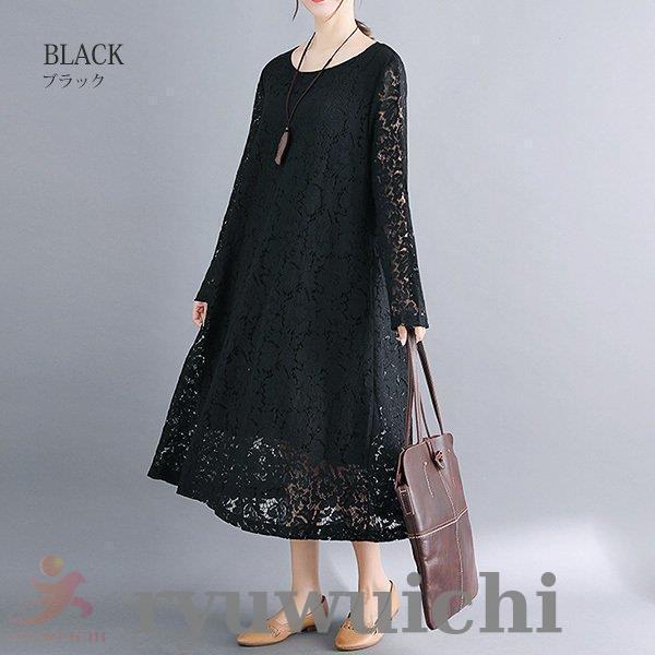 ワンピース 総レース レディース ロング 長袖 シースルー袖 結婚式 二次会 20代 30代 40代 黒