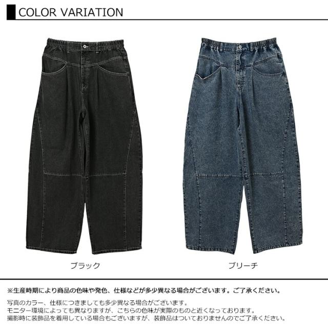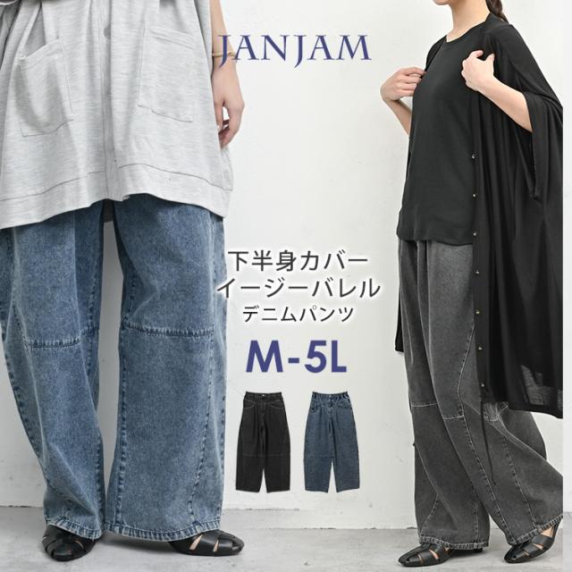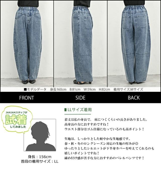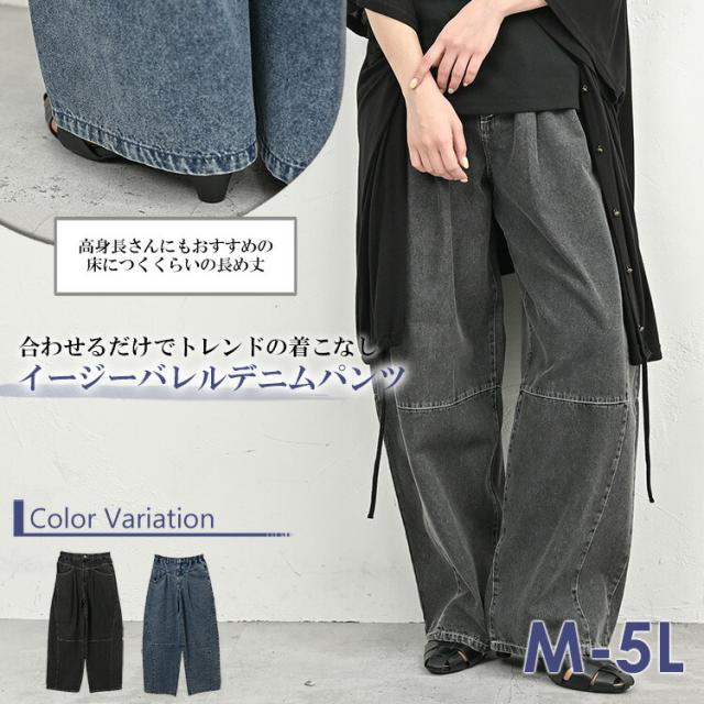 送料無料※沖縄/北海道対象外 大きいサイズ レディース イージーバレルデニムパンツ ロング丈 ウエストゴム ウォッシュ加工 ボトムス M/LL/3L/4L/5L ゆったりサイズ ぽっちゃり女子 プラスサイズ