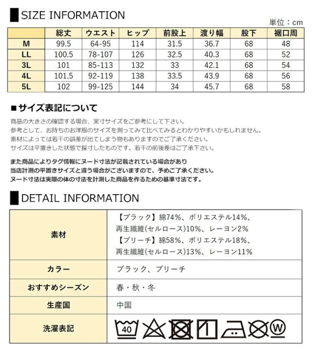 5L:総丈102 ウエスト99-125 ヒップ144 前股上34 渡り幅45.7 股下68 裾口周58