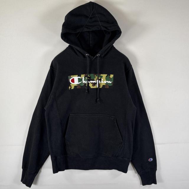 古着 チャンピオン Champion パーカー リバースウィーブ カモフラプリント ビッグロゴ フーディ スウェット SMALL ブラック メンズ