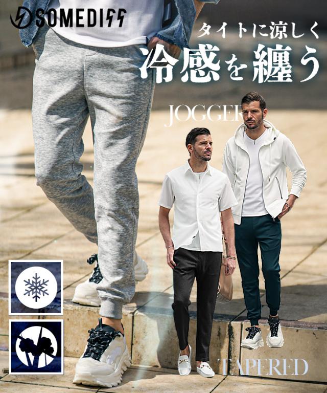 穿いて、ひんやり『"接触冷感"毛玉レススウェットパンツ』【"接触冷感"毛玉レススウェットパンツ】■Design/デザインラフなアイテムもスマートに穿きこなせる、SOMEDIFF自慢のスウェットパンツから、ついに"接触冷感"タイプが登場!体温上昇を抑える接触冷感素材を用いることで、夏場の不快感を生む"ムレ"や"汗ばみ"を防ぎ、快適な穿き心地を実現。スリムなシルエットでありながら快適な穿き心地を楽しめるこのパンツは、毛玉が出来にくいという、機能面でも優秀なのが魅力。軽快に穿きこなせるジョガータイプと、ラフすぎないきれいめな印象を与えるテーパードタイプの2タイプ展開。ジョガータイプに施された膝元の立体裁断デザインは、さりげないギミックとして一味加えてくれる。