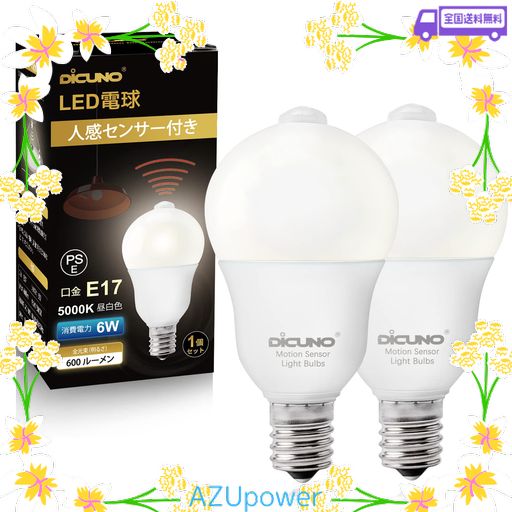 DICUNO LED電球 E17口金 人感センサー 6W 60形相当 600LM 昼白色 5000K 明暗センサー付き 消し忘れ防止 赤外線センサ 自動点灯 高輝度 AC100V 非調光 省エネ PSE認証済み 2個入