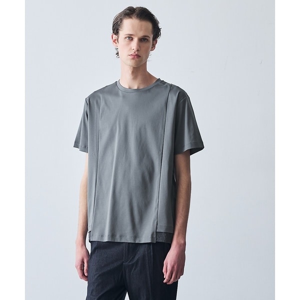 裾にシャドーストライプ柄のシャツ素材を施した、レイヤード風デザインがポイントの半袖Tシャツ。トップスで着用した時の程良いアクセントが一枚着として映えるデザインです。ベーシックなシルエットで汎用性が高く、着回しにも最適です。