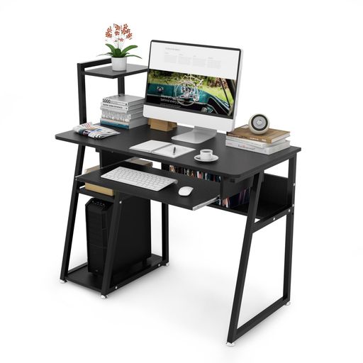【キーボードスライダー付き&一体型収納棚】?天板下のキーボードスライダーにキーボード&マウスや本やノートパソコンなど収納できるのでその分天板を広く使えます。使わない時は奥にスライドしておくと、場所も取らず見た目もスッキリします。 ?収納棚がデスクと一体化して、左側に3段棚付き、欲しい時に手が届けて、立ち上がる手間を減らすことができて、スペースを無駄にしない収納上手なデスクです。?中棚板を除ければ、ごみ箱など、さらに高い物もスッポリ収納できます。?天板の下に本棚付いて、漫画やCDなど収納できます。?上棚はコンパクトにして、邪魔しなく、ゆったりと作業をすることができます。