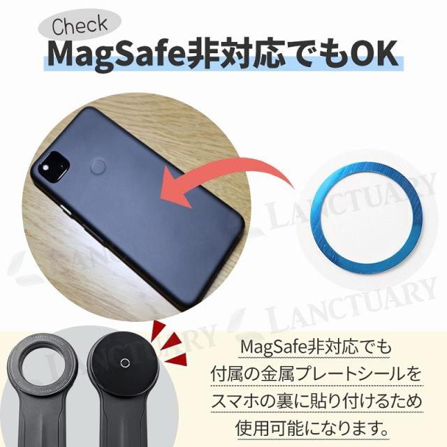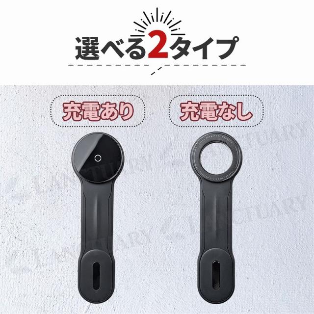 重さはなんと1.8kgまで耐えられることができます。またホルダーは360度回転可能となっており自分のお好みの角度にいつでも調整可能です。もちろんスマホの向きも横でも縦でも設置可能。設置の仕方も自由自在。3Mテープを張りつけるだけの簡単設置で安全を確保できれば設置場所も問いません。MagSafe非対応でも付属の金属プレートシールをスマホの裏に貼り付け使用可能に◎充電あり、なしが選べる2タイプとなっています。