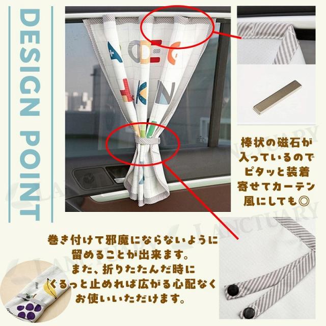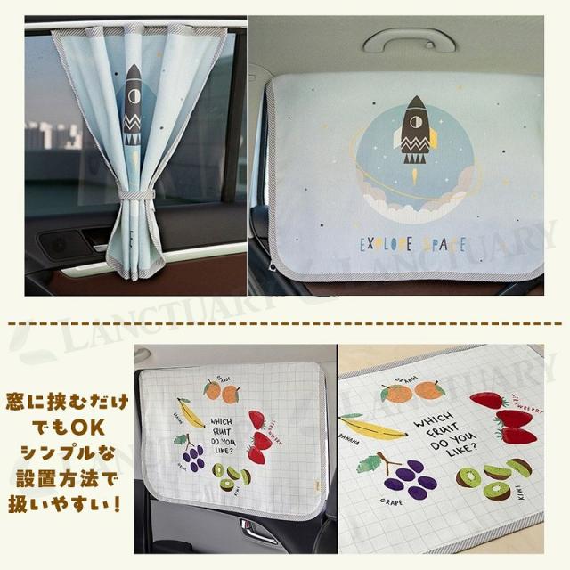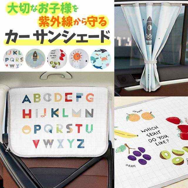 | 主な仕様 | 商品名:カーサンシェード 車内 日よけ 種類:くだもの・水族館・ロケット・太陽と月・アルファベット サイズ:65.5×46.5 重さ:95g 特徴: マグネットで簡単に車の後部座席のドアやスライドドアに装着。 カーテンをまとめる紐付きなので外の景色が見たいときは結んでまとめられます。 夏の日差しが強いとき、車で子供が就寝してしまった時の日よけになるのでママの困った時の便利アイテム。 |