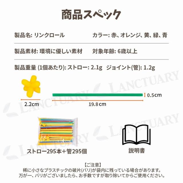 | 主な仕様 | 製品名: リンクロール 製品の色: 赤、オレンジ、黄、緑、青 製品素材: 環境に優しい素材 対象年齢: 6歳以上 製品サイズ: ストロー: 19.8cm × 0.5cm 管: 2.2cm × 2.2cm 製品重量 (1個あたり): ストロー: 2.1g 管: 1.2g |