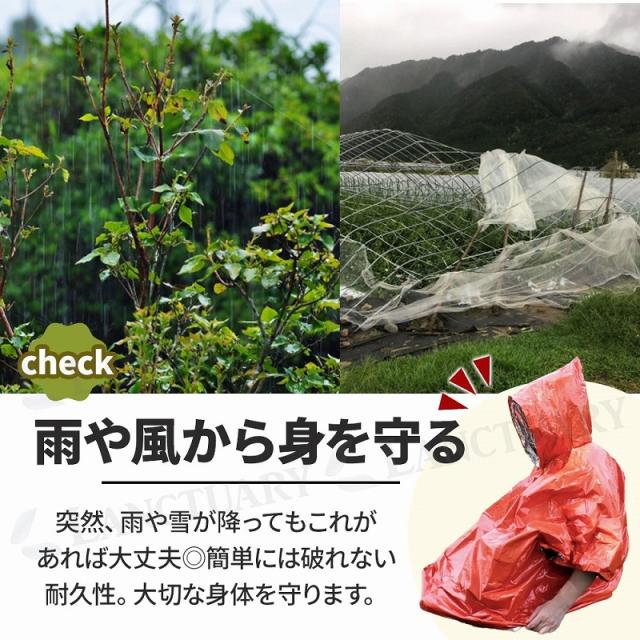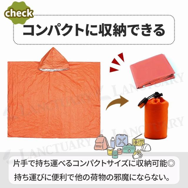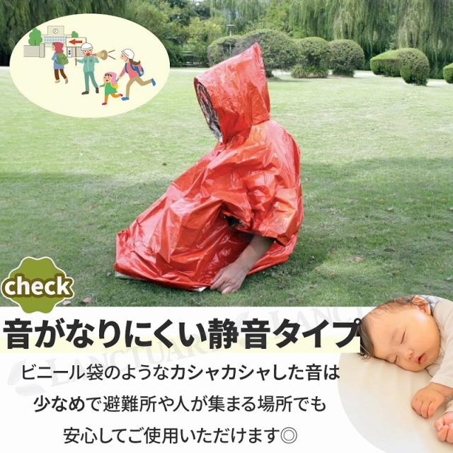 すっぽり被ってしっかり保温。快適な温度感で雨や風から大切な身体をしっかり守ってくれます。耐久性にも長け、簡単には破れません。またビニール袋のようなカシャカシャという音も少なめで周りを気を使わずご使用いただけます。コンパクトに折り畳め、持ち運びにも便利な点も嬉しいポイント◎災害時だけでなくレジャーやアウトドア時にも大活躍間違いなし。
