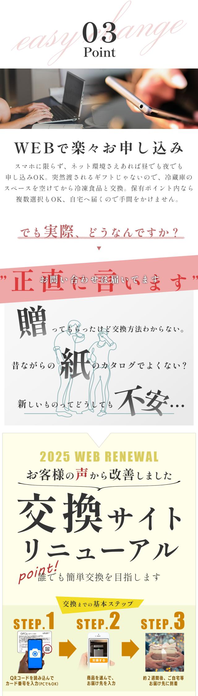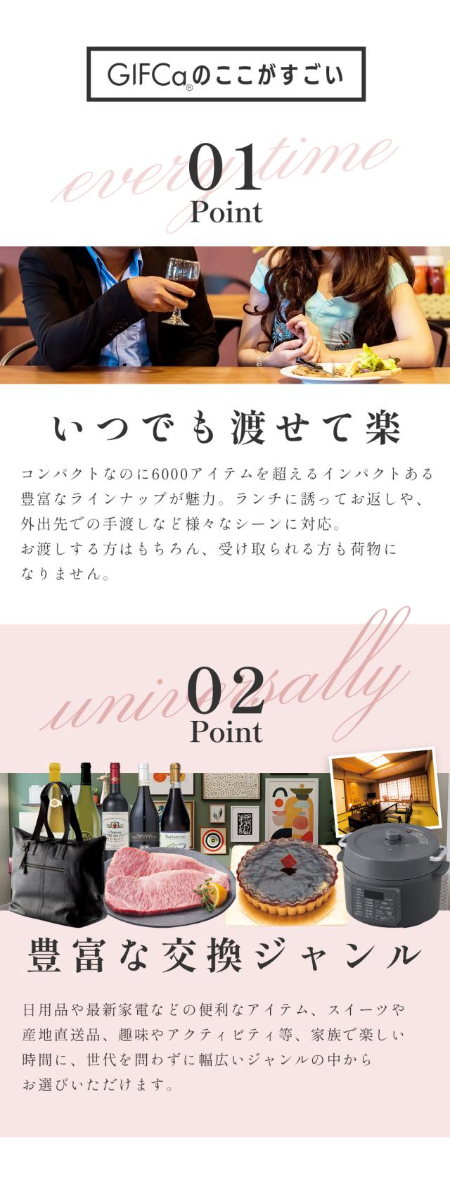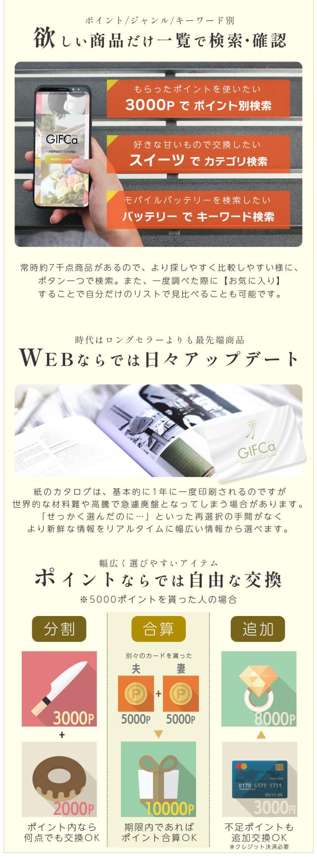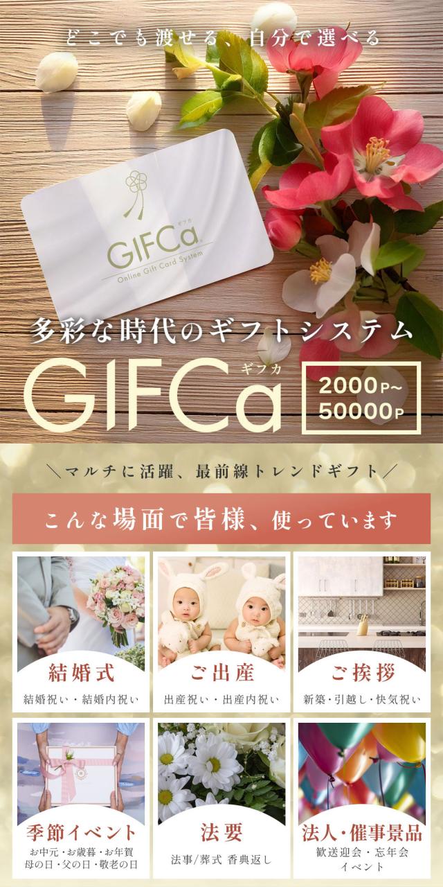 ギフカはギフトカードを受け取られた方が、ネット上の「GIFCa商品交換サイト」を利用して贈られたポイントを使って、自由に商品交換ができる新しいコンセプトの贈り物です。