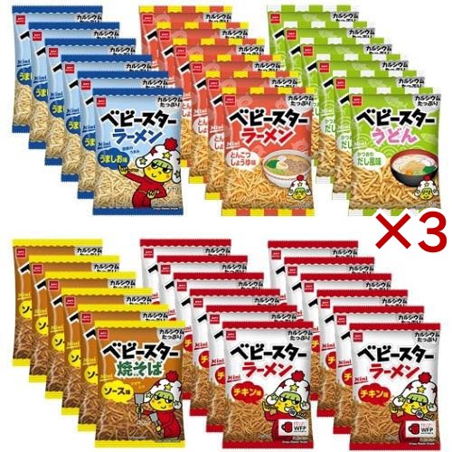 | ベビースターラーメンチキン味ミニ:21g×12袋、ベビースター焼そばソース味ミニ:20g×6袋、ベビースターラーメンうましお味ミニ:20g×6袋、ベビースターラーメンとんこつしょうゆ味:20g×6袋、ベビースターうどんかつおだし味:20g×6袋 計5種36袋 |