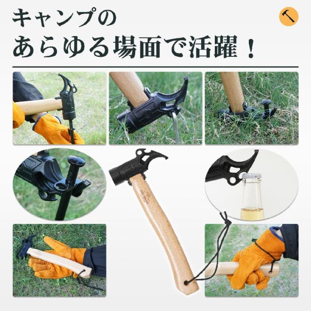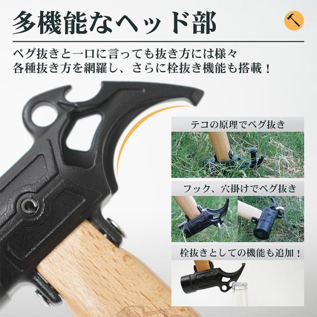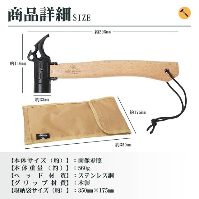 ペグハンマー キャンプハンマー 多機能へツド部 収納袋付き 抜け防止 広い打面 ステンレス鋼 木製持ち手 テント設営 キャンプ設営 od647