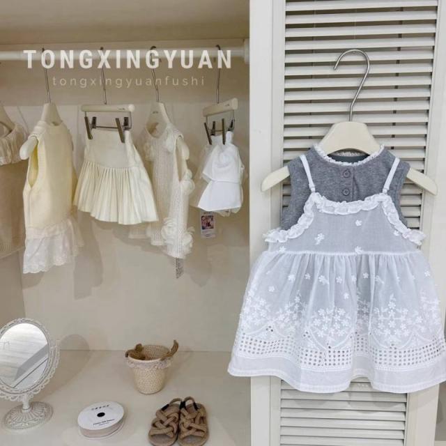 女の子 キッズ服 子供服 キャミソールワンピース ベスト 2点セット 灰色 レース柄 夏新作 可愛い 新品 韓国風 1-6歳
