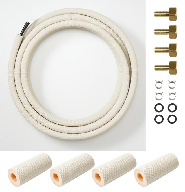 梱包内容:エコユニーク1巻(ペア状態3M)、タケノコ継手8組、継手用保温材8個