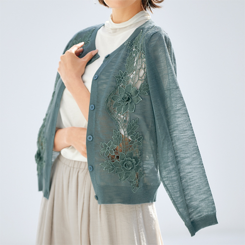 フロントに透かし柄の刺しゅうレースをあしらい、立体的なフラワーモチーフを咲かせた華やかなカーディガン。