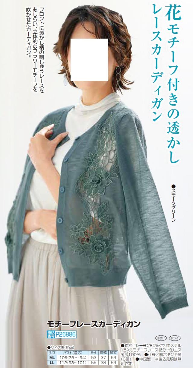 モチーフレースカーディガン スモークグリーン カーディガン 長袖 クルーネック レディース 婦人服 ミセス シニア 女性 くすみグリーン 花柄 無地 レース フェミニン 上品 緑 丸首 シニアファッション 40代 50代 60代 70代 80代 90代 母の日 お母さん 春夏 nss p26886