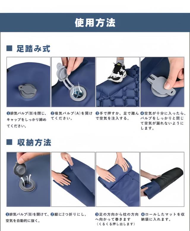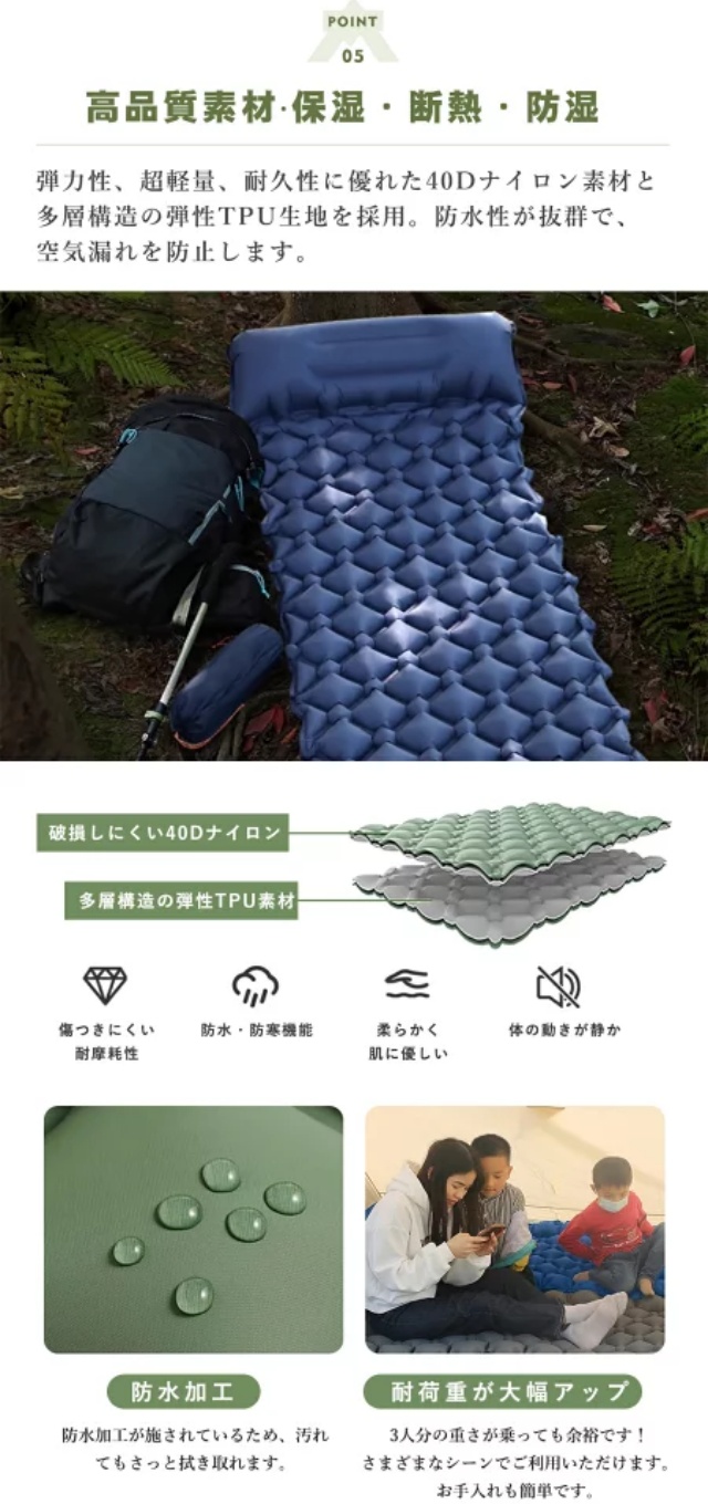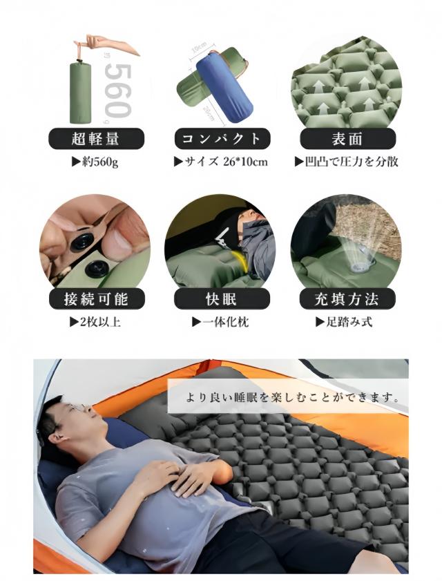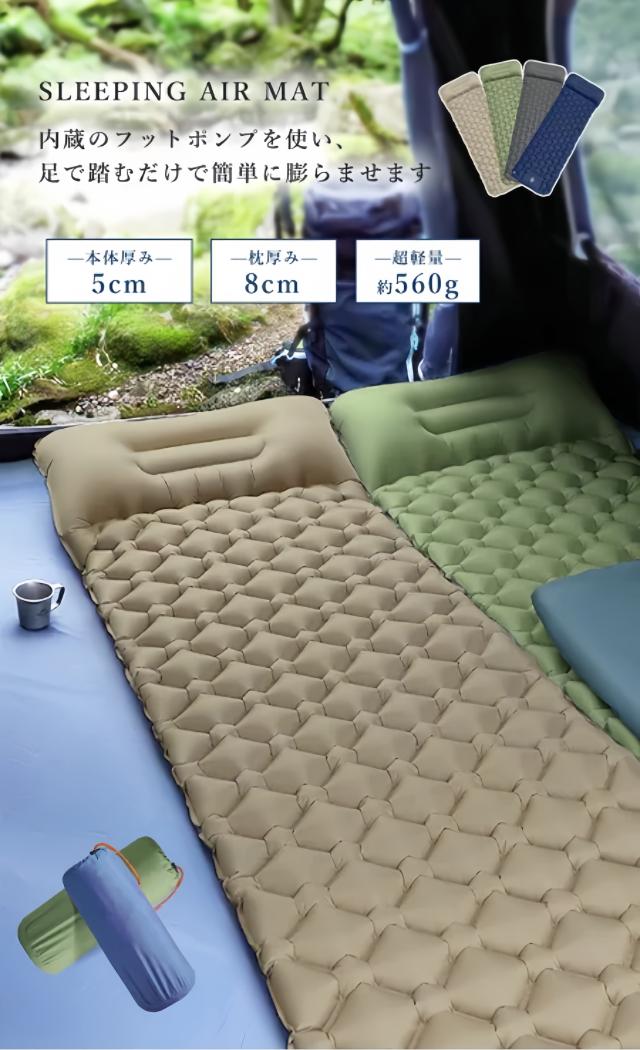 エアーマット エアーベッド キャンプマット アウトドアマット 車中泊マット 足踏み式 枕付き 折畳み式 幅広厚手 軽量 テント キャンプ コンパクト 防水 防潮 防災グッズ 40Dナイロン+TPU生地 収納袋付き
