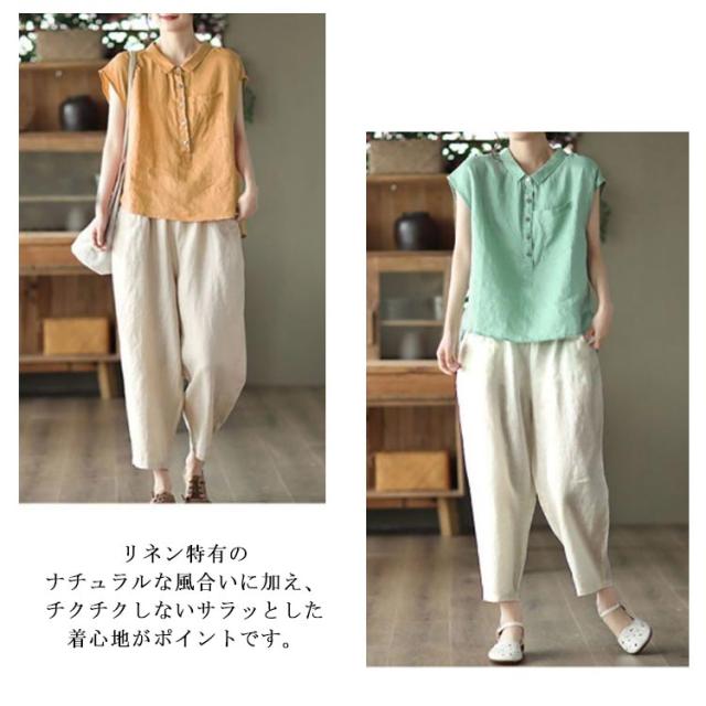 レディース 夏 麻 40代 リネン ブラウス シャツ ワイドパンツ セットアップ 夏用 カジュアル リネンパンツ パンツ お洒落 トップス 半袖 上下セット 綿 イージーパンツ ウエストゴム きれいめ 涼しい 部屋着 リネン ゆったり 体型カバー 無地