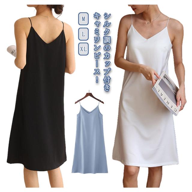 レディース カップ付き インナーワンピース キャミソール 細ストラップ キャミワンピ シルク調 ブラ キャミ シルク調 サテン 膝丈 インナー おしゃれ ペチコート ノンワイヤー シルク 大きいサイズ 無地 透け防止 肌着