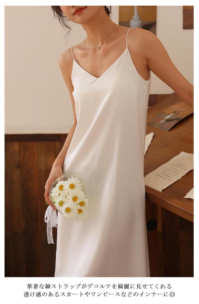 | シルク調のカップ付きキャミワンピース! ブラ+キャミ+ベチコートがこれ1枚でOK! ノンワイヤーなので締め付け感もなく快適な着心地なのも嬉しいポイント◎ 華奢な細ストラップがデコルテを綺麗に見せてくれる 透け感のあるスカートやワンピースなどのインナーに◎ | |