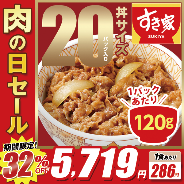 1食あたり286円!!32%OFF!! 肉の日セール!! すき家 牛丼の具 120g 20パック 【送料無料】【冷凍(クール)】