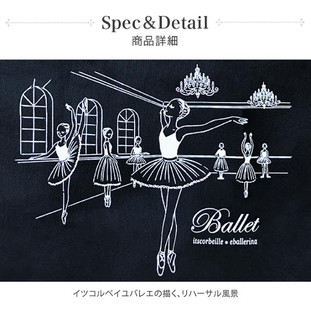 イツコルベイユバレエの描く、リハーサル風景のプリントが可愛らしく、黒地に白抜きなので甘すぎないのがポイント。