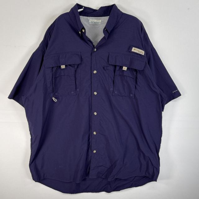古着 コロンビア Columbia 半袖シャツ PFG フィッシングギア ワンポイント ロゴ ネイビー 無地 メンズ