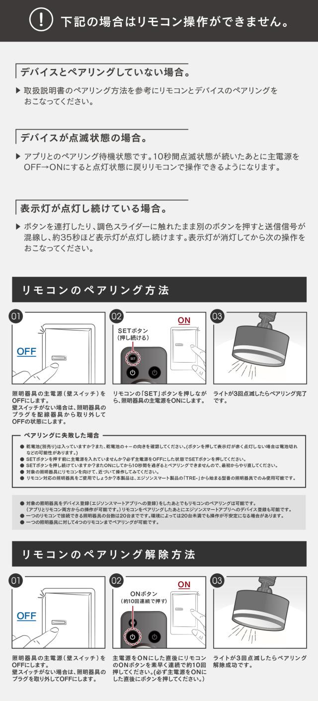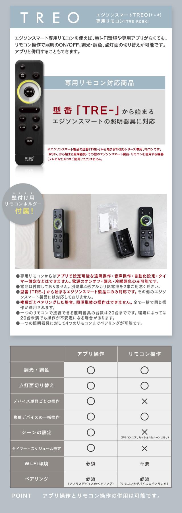 | 対応製品 | 型番「TRE-」から始まるエジソンスマート「TREO」シリーズの照明器具 ※「RST-」から始まる照明器具にはご使用いただけません。 |