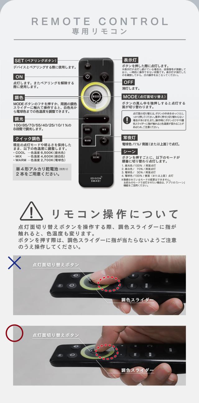 | ご使用上の注意 | ●こちらの商品は海外では使用できません。また一般屋内専用です。 ●本製品は、エジソンスマート製品の型番「TRE-」から始まる照明器具専用です。「RST-」から始まる照明器具・その他のエジソンスマート製品・リモコンを使用する機器(テレビなど)にはご使用いただけません。 ●点灯直後や明るさを切り替えた直後など、リモコン信号を受信しにくくなる場合があります。その場合は少し時間を置いてから再度お試しください。 ●天井や壁、床の材質、その他家電製品のノイズの影響によってリモコンが操作しにくくなることがあります。 ●下記の場合はリモコン操作ができません。 ・デバイスとペアリングしていない場合。 ⇒取扱説明書を参考にリモコンとデバイスのペアリングをおこなってください。 ・デバイスが点滅状態の場合。 ⇒アプリとのペアリング待機状態です。10秒間点滅状態が続いたあとに主電源をOFF→ONにすると点灯状態に戻りリモコンで操作できるようになります。 ・表示灯が点灯し続けている場合。 ⇒ボタンを連打したり、調色スライダーに触れたまま別のボタンを押すと送信信号が混線し、約35秒ほど表示灯が点灯し続けます。表示灯が消灯してから次の操作をおこなってください。 |