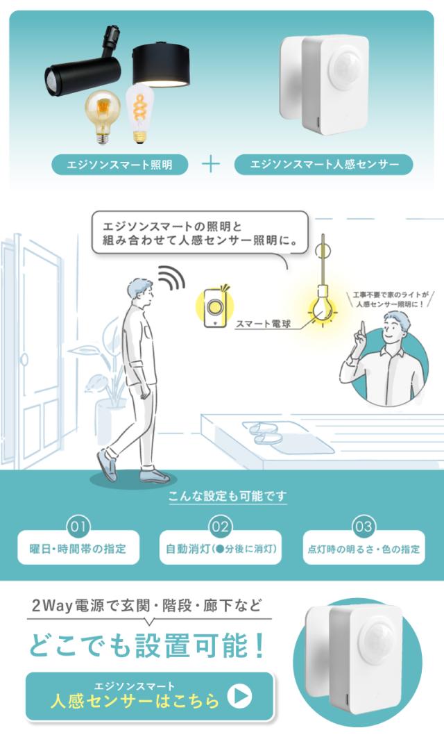 エジソンスマートの人感センサーと組み合わせることで、人感センサー照明としてもご活用いただけます。
