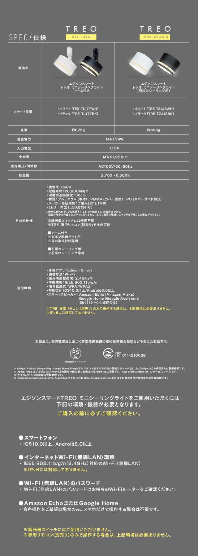 | 種類・カラー/型番 | 【アーム付き(ダクトレール用)】 ・ホワイト[型番: TRE-TL177WH] ・ブラック[型番: TRE-TL177BK] 【引掛けシーリング用】 ・ホワイト[型番: TRE-TZ413WH] ・ブラック[型番: TRE-TZ413BK] |
