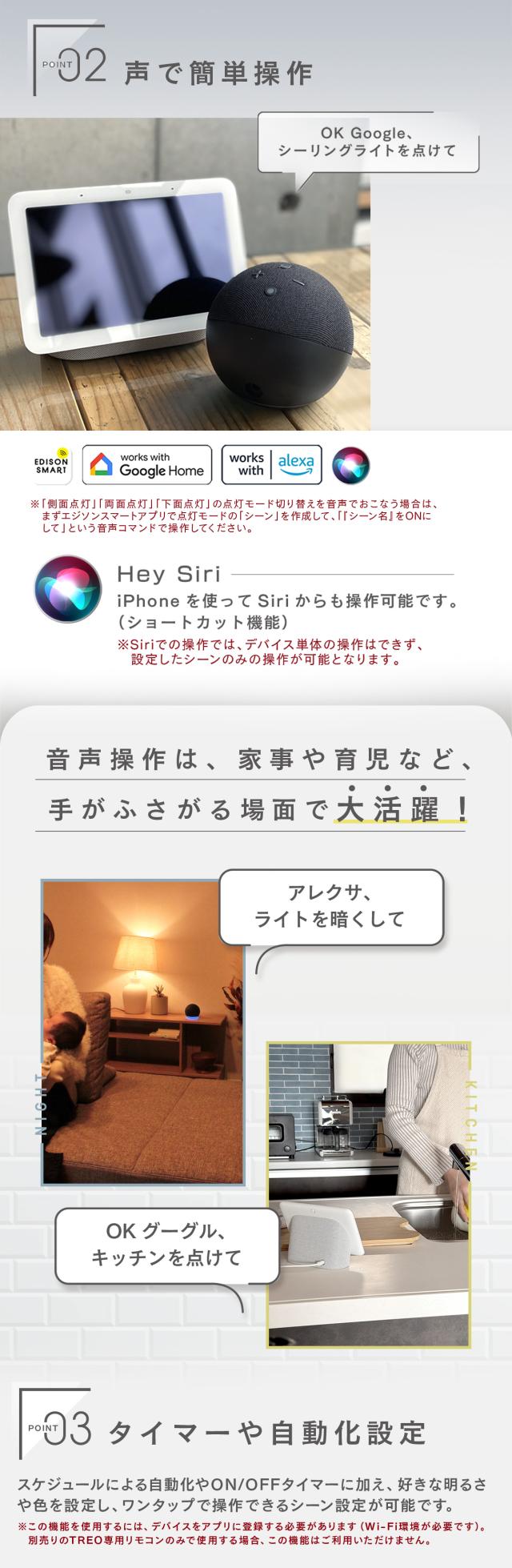 Wi-Fi接続でスマホやタブレットから簡単操作でき、Amazon Alexa・Google Home・Siriによる音声操作も対応。