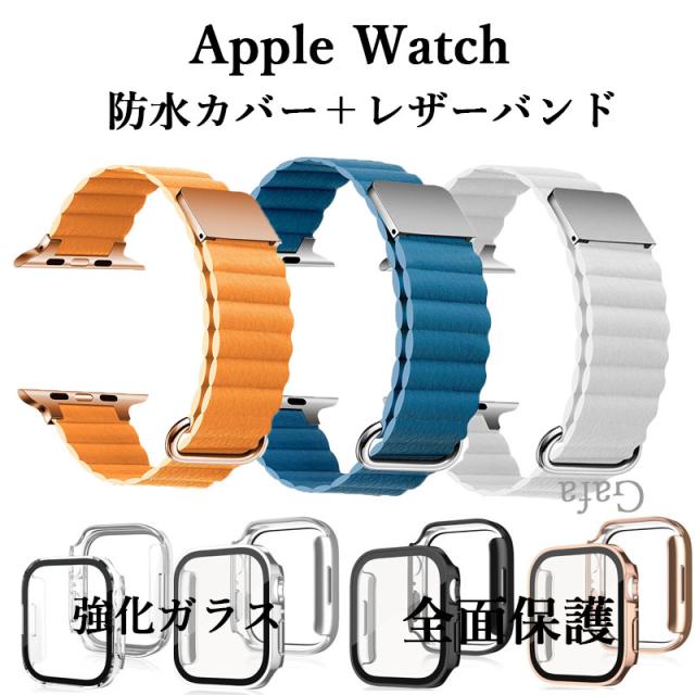アップルウォッチカバーバンドセット レザー Apple watchカバーバンド 防水強化ガラスカバー Apple Watch 40 41 42 44 45 46 49mm