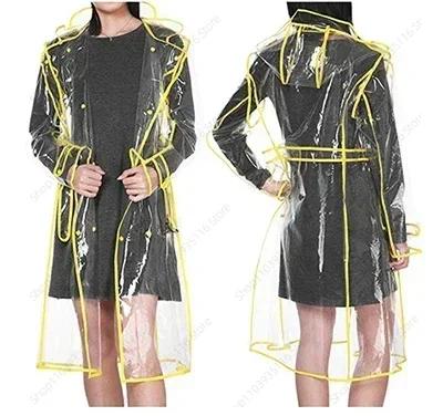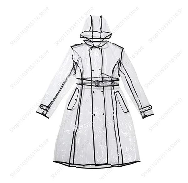 防水透明プラスチッククリアロングレディースレインコート女性男性ファッションレインコートジャケットフード付きベルト EVA