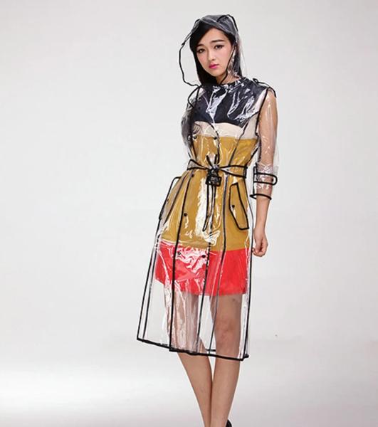 防水透明プラスチッククリアロングレディースレインコート女性男性ファッションレインコートジャケットフード付きベルト