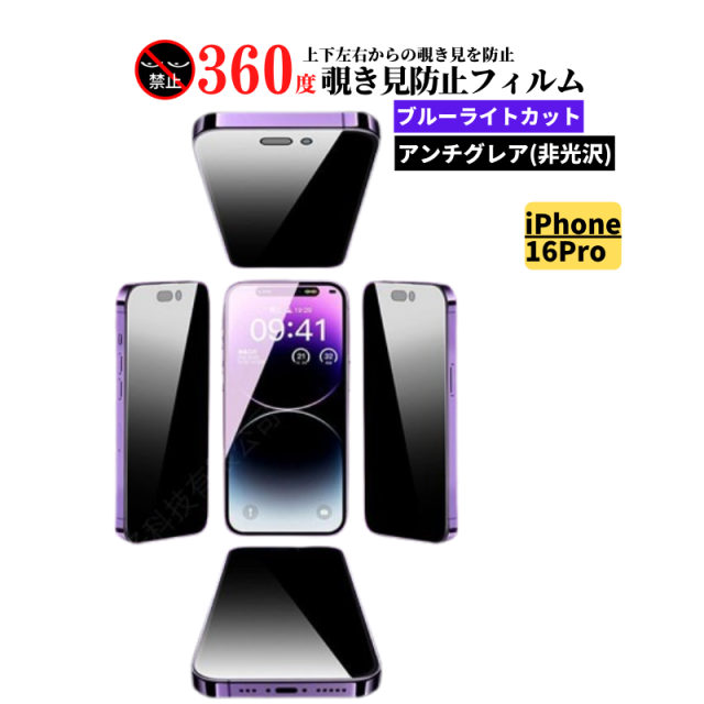iPhone 16Pro 360度 覗き見防止 ブルーライトカット アンチグレア 強化ガラス フィルム 保護フィルム ガラスフィルム 非光沢 マット 反射防止 指紋防止 硬度9H 全面保護 iPhone 16 Pro 16プロ