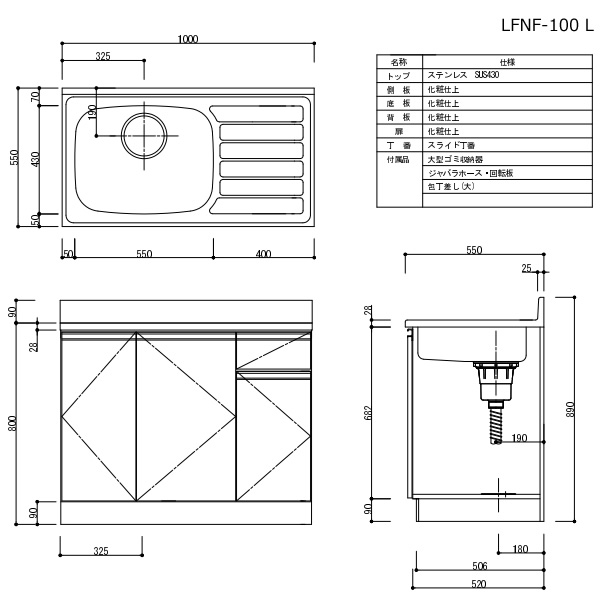 販売エリア:京都府、大阪府、兵庫県、滋賀県、奈良県、和歌山県 ※一部山間部地域を除く ■品番:LFNF-100-DW-L ■カラー:ダークオーク ■サイズ:W1000mm×D550mm×H800mm ■シンク位置:左 ■内部:化粧仕上げ ■底板:化粧仕上げ ■丁番:スライド丁番 ■大型ゴミ収納器付・ホース付 ※記載は商品仕様の一部です。仕様説明不足等の理由での返品はできません。特に適合等は必ずご確認ください。