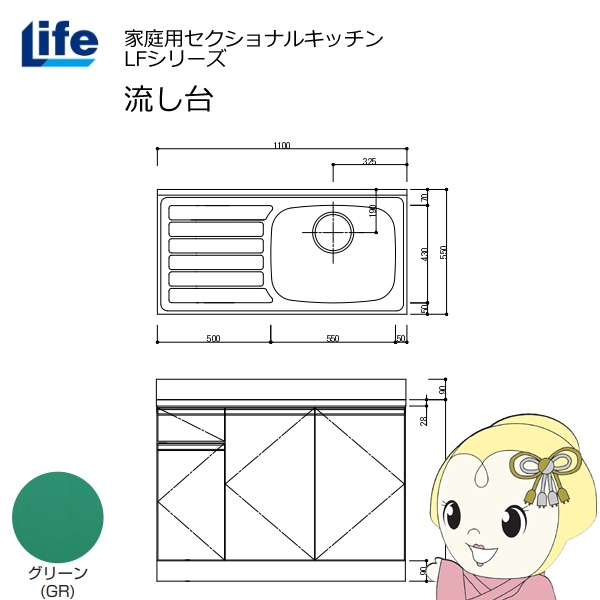 【近畿限定販売】家庭用セクショナルキッチン LFシリーズ ライフ 流し台 右水槽 奥行550mm 化粧仕上げ グリーン LFNF-110-GR-R