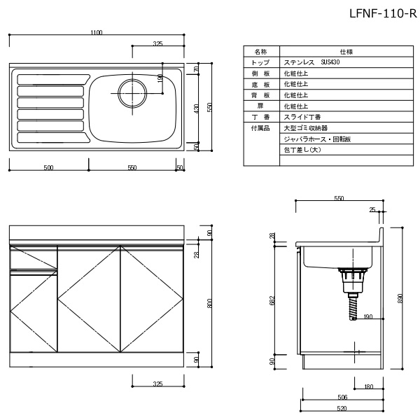 販売エリア:京都府、大阪府、兵庫県、滋賀県、奈良県、和歌山県 ※一部山間部地域を除く ■品番:LFNF-110-GR-R ■カラー:グリーン ■サイズ:W1100mm×D550mm×H800mm ■シンク位置:右 ■内部:化粧仕上げ ■底板:化粧仕上げ ■丁番:スライド丁番 ■大型ゴミ収納器付・ホース付 ※記載は商品仕様の一部です。仕様説明不足等の理由での返品はできません。特に適合等は必ずご確認ください。