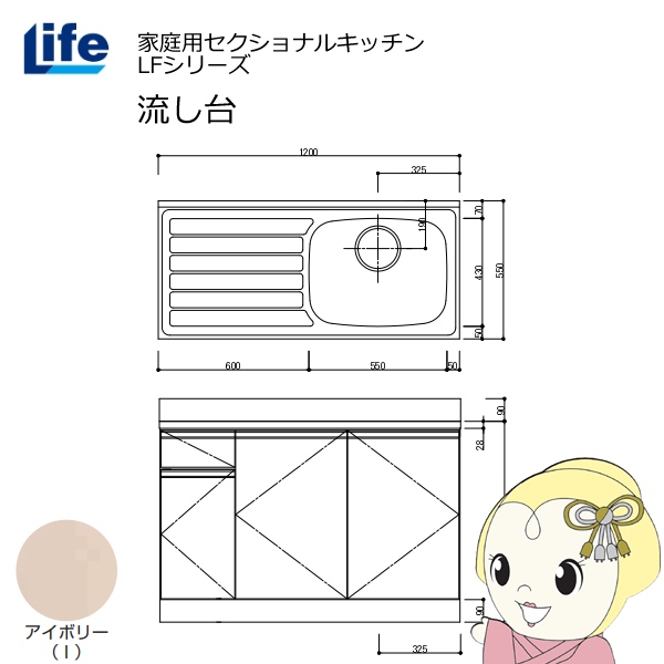 【近畿限定販売】家庭用セクショナルキッチン LFシリーズ ライフ 流し台 右水槽 奥行550mm 化粧仕上げ アイボリー LFNF-120-I-R