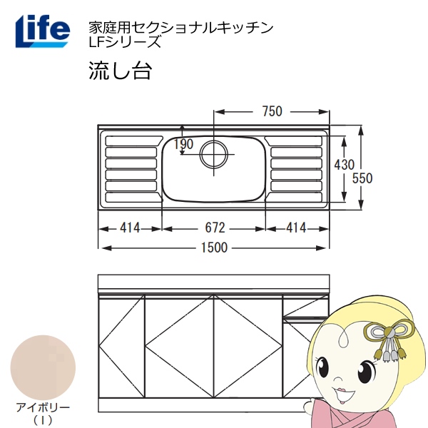 【近畿限定販売】家庭用セクショナルキッチン LFシリーズ ライフ 流し台 中水槽 奥行550mm 化粧仕上げ アイボリー LFNF-150-I