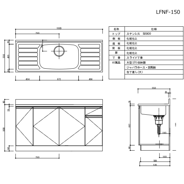 販売エリア:京都府、大阪府、兵庫県、滋賀県、奈良県、和歌山県 ※一部山間部地域を除く ■品番:LFNF-150-I ■カラー:アイボリー ■サイズ:W1500mm×D550mm×H800mm ■シンク位置:中央 ■内部:化粧仕上げ ■底板:化粧仕上げ ■丁番:スライド丁番 ■大型ゴミ収納器付・ホース付 ※記載は商品仕様の一部です。仕様説明不足等の理由での返品はできません。特に適合等は必ずご確認ください。