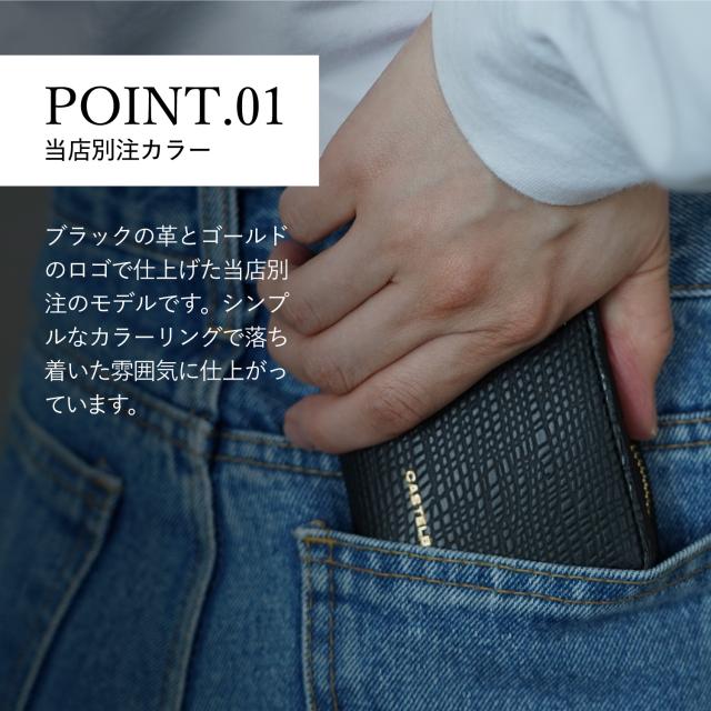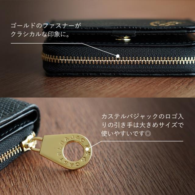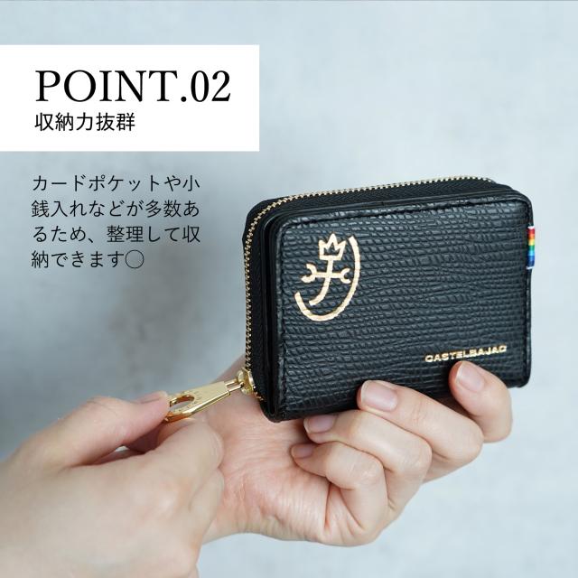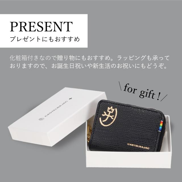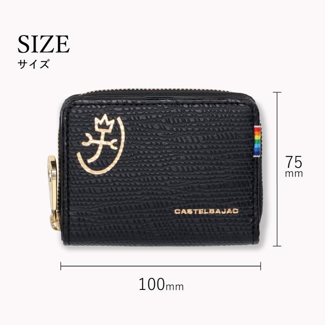 カステルバジャックからレインボーシリーズの別注ミニ財布がリリース。財布の本体素材にはキッチュなイメージの角シボエンボスを施しツヤ感を出した牛革を使用。CASTELBAJACのロゴ刻印側にはよりカステルバジャックらしい雰囲気のポップなレインボーカラーテープをワンポイントに使用。カステルバジャックの家紋マークとロゴ刻印もゴールドで箔押しすることでゴージャスな印象に仕上げています。
