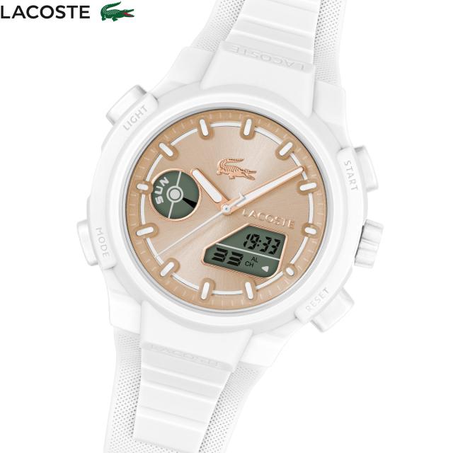 タフなルックスを可憐なホワイトカラーでフェミニンに彩ったアナデジウォッチ。プラスチックとシリコンでステンレスケースを覆ったタフネスデザイン。アナログ針と、2つのデジタルインダイヤルを備えるアナデジ仕様。どんなコーディネイトでも目を引く40mmのビッグフェイス。ホワイト×ベージュのフェミニンなカラーリング。「ラコステ」は、フランスの伝説的テニスプレイヤーであり優れた発明家でもある、ルネ・ラコステが1933年に設立したプレミアムカジュアルブランド。トレードマークであるワニは、ラコステの現役時代の粘り強いプレイスタイルから付いたニックネームが由来。ブランドのアイコンであるポロシャツをはじめ、メンズ、ウィメンズ、フットウェア、レザーグッズなどトータルシルエットを取り揃えております。【ラコステ LACOSTE】